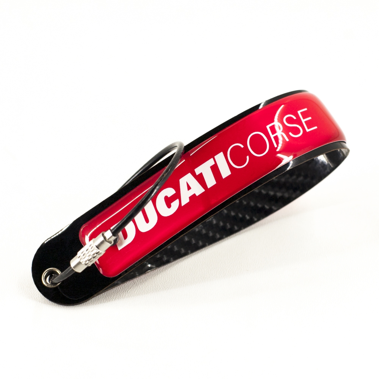 Ducati Corse Beyaz Logolu Kırmızı, 5D Karbon Fiber, Çelik Tel Uçlu At Nalı Anahtarlık